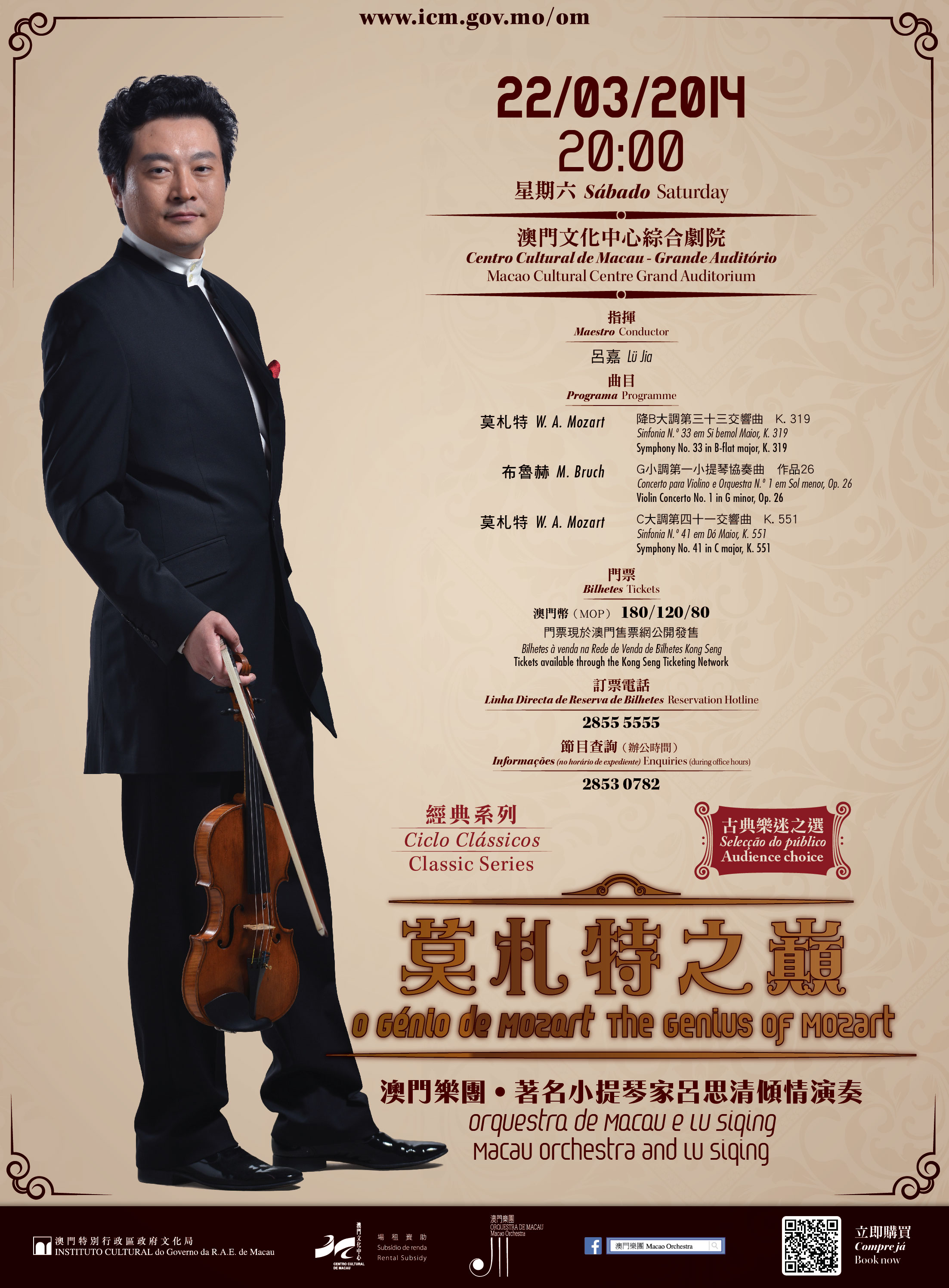 本月的音乐会优惠, 由澳门乐团音乐总监兼首席指挥吕嘉, 以及着名小提琴家吕思清共同演奏, 多首莫札特经典乐曲将被重新演译, 身为经典乐迷的你岂能错过!!