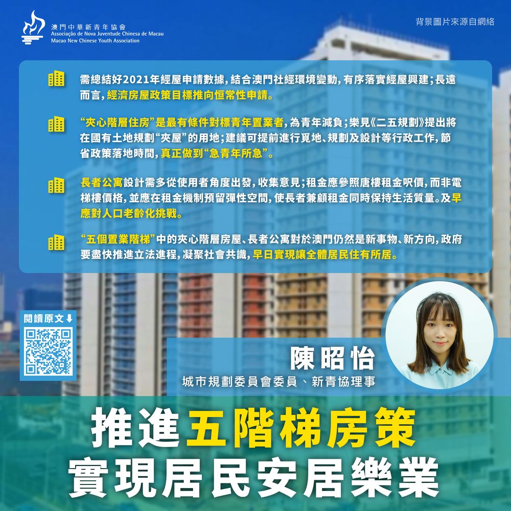 “五个置业阶梯”中的夹心阶层房屋、长者公寓对於澳门仍然是新事物、新方向,政府要尽快推进立法进程,凝聚社会共识,早日实现让全体居民住有所居。