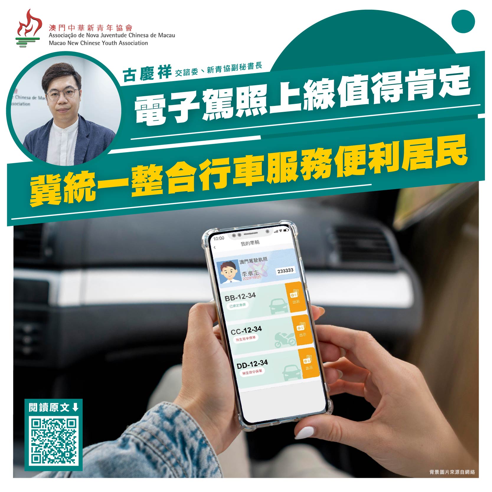 《以电子方式出示驾驶车辆所需文件》正式生效。经绑定后,市民可透过「一户通」出示驾驶执照和车保,交谘委、新青协副秘书长古庆祥肯乐见当局持续推动与市民生活密切相关的服务实现电子化,认同执照电子化能提高前线执法效率,长远落实便民目标。