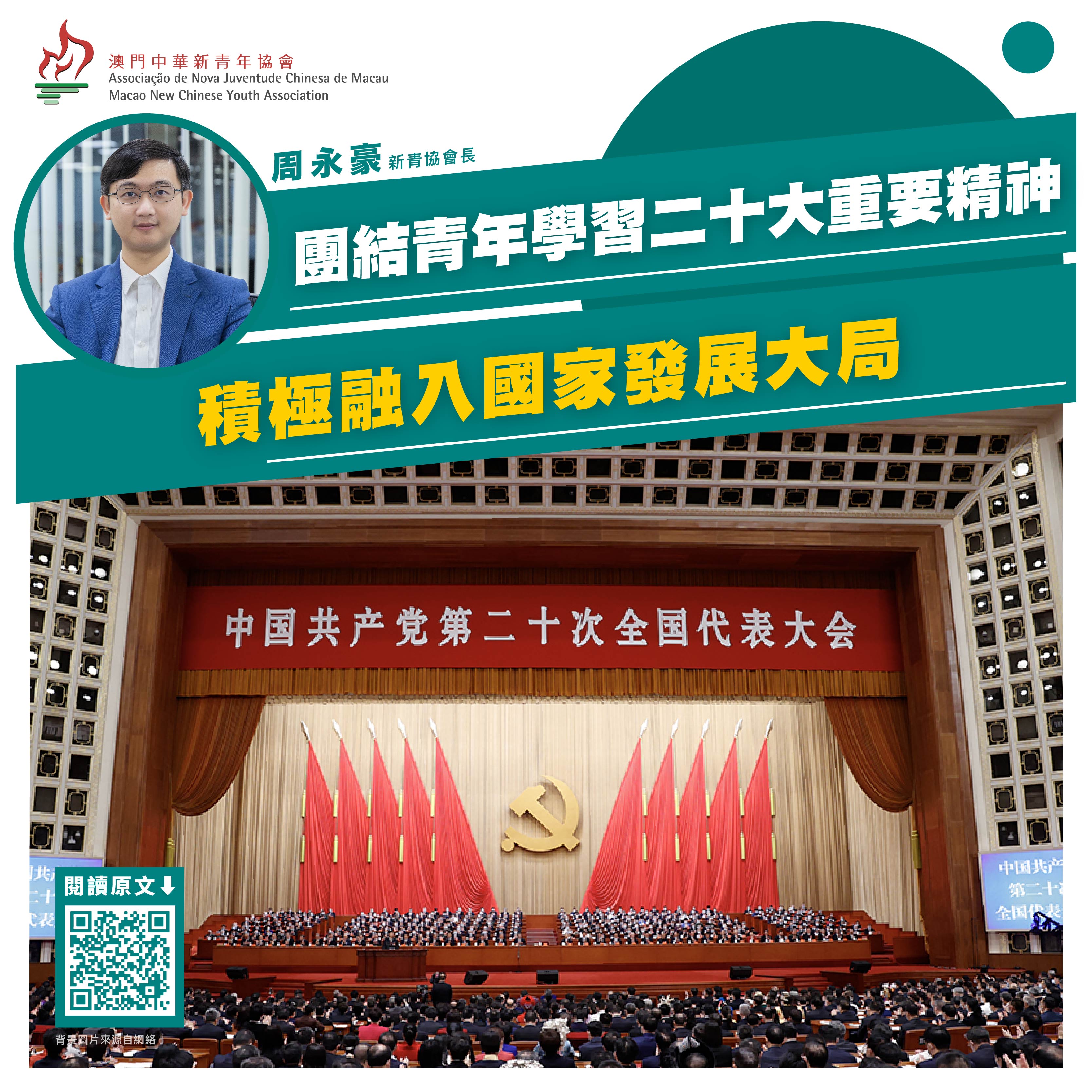 周永豪表示,相信在中央的坚强领导和大力支持下,澳门特区政府一定会按照二十大的决策部署,全面准确、坚定不移贯彻“一国两制”方针,落实“爱国者治澳”根本原则,维护国家主权、安全、发展利益。新青协将继续团结凝聚澳门青年,认真学习领会二十大的重要精神,积极融入国家发展大局,立志做有理想、敢担当、能吃苦、肯奋斗的新时代好青年,为实现中华民族伟大复兴贡献青春力量。