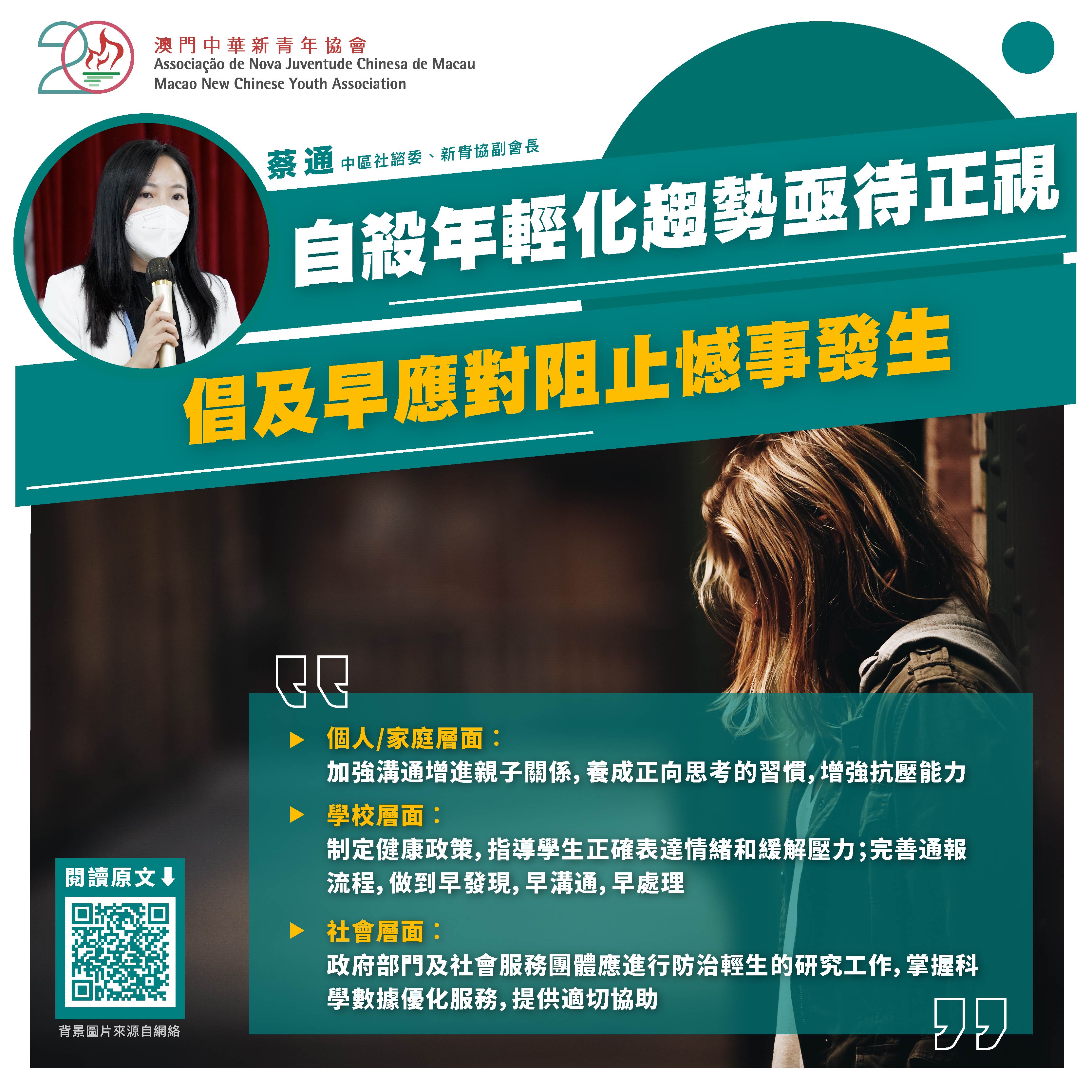 惟近年在疫情影响下,不少居民心理压力增加,情绪困扰增多,自杀个案上升,并呈年轻化趋势,需要社会正视。轻生成因复杂多样,涉及精神健康、心理因素、人际/家庭关系、社会、经济等因素,但只要及早发现及正确应对,仍可以阻止憾事发生。
