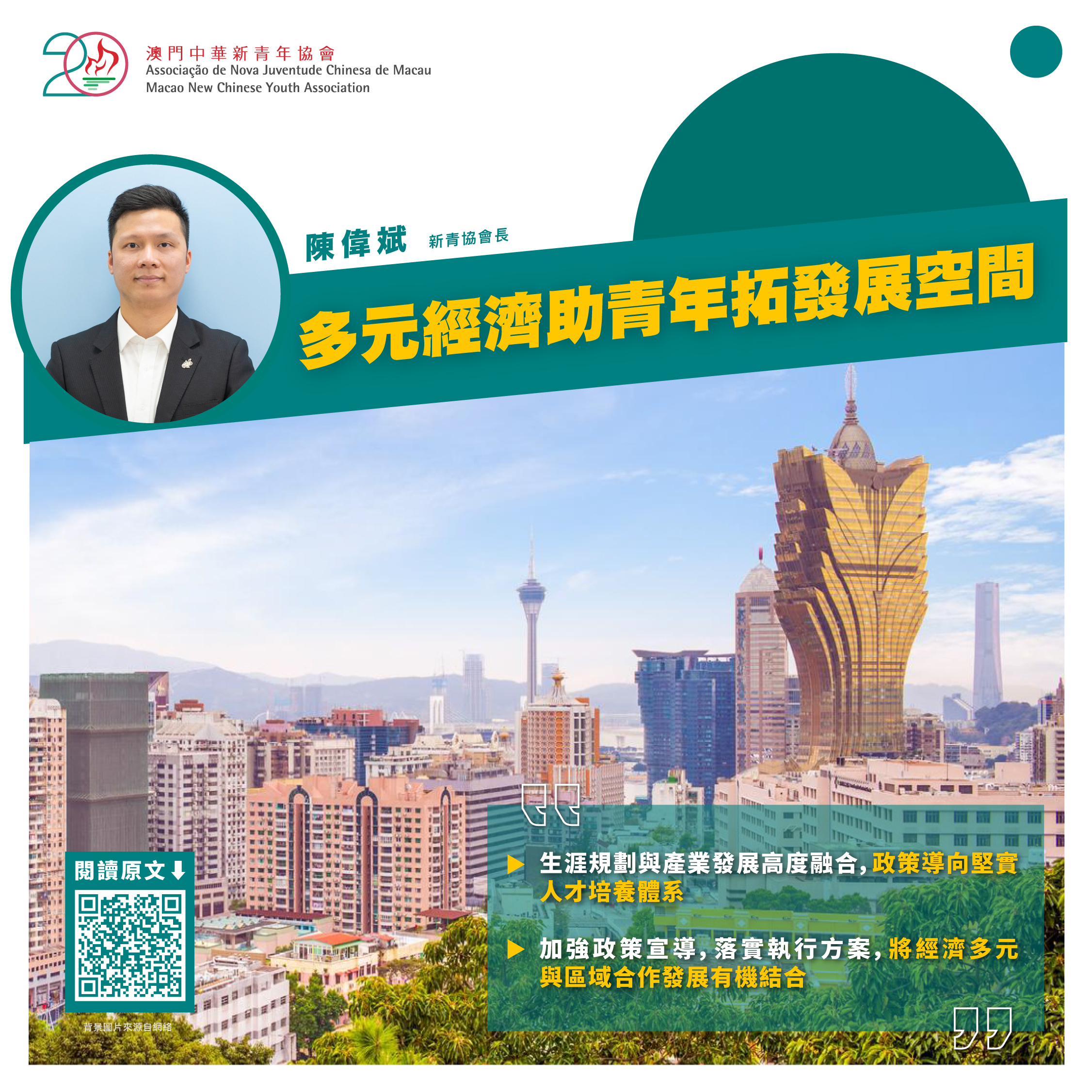 对於本澳青年而言,更是喜闻乐见及深受鼓舞,规划为青年人的未来发展作出了重要指引,获得更多机遇及更广濶的发展空间。政府要发挥好「一国两制」制度优势和特殊地位功能,引导青年对接「1+4」产业,充分利用大湾区和深合区等发展机遇,融入国家发展大局,为青年发展提供丰沃土壤,为实现澳门经济可持续发展贡献力量。