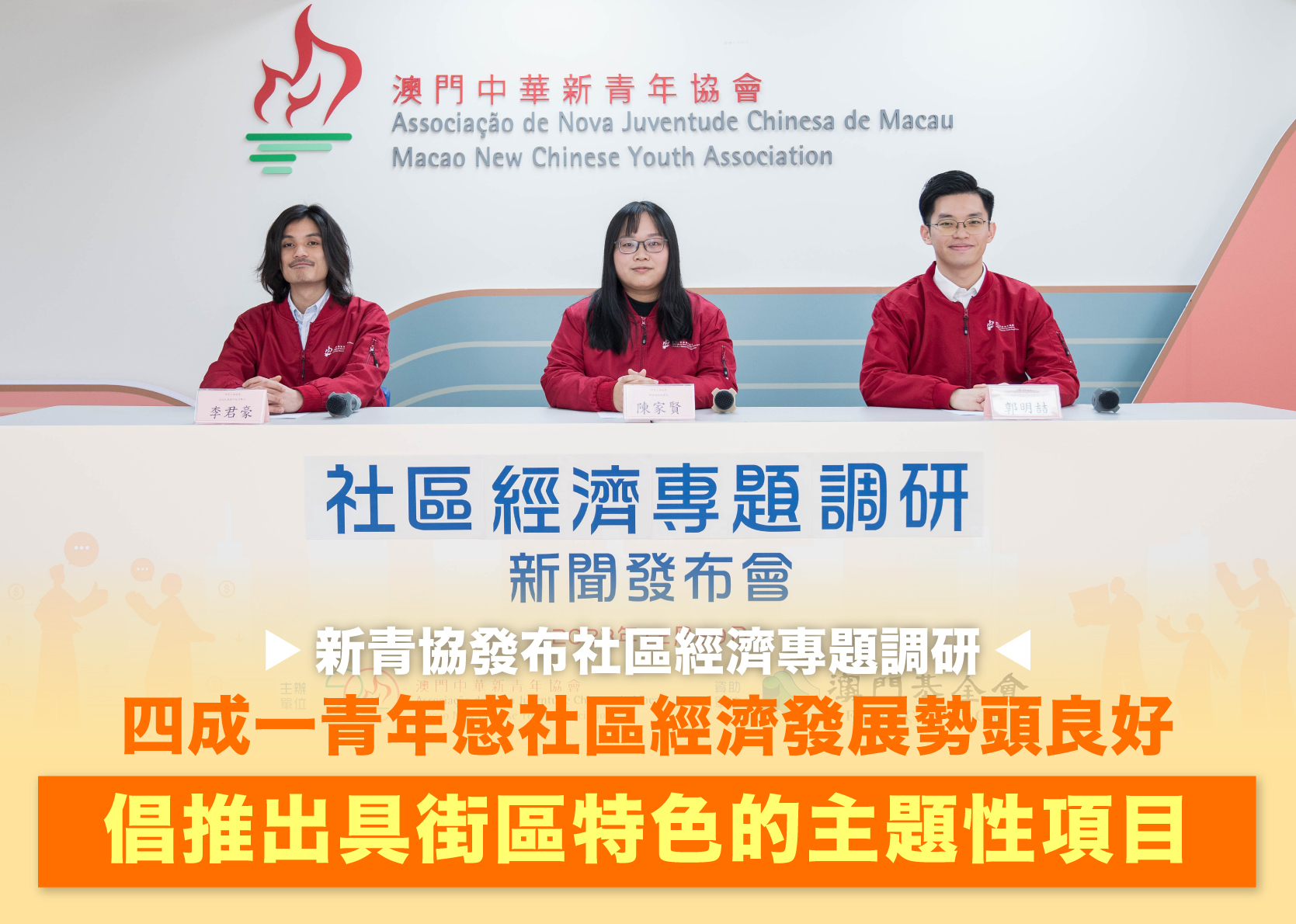 发布会於新青协青年中心举办,由郭明喆、新青协副秘书长陈家贤、研究小组成员李君豪主持,研究获澳门基金会资助。调查团队指出,近年政府积极推动社区经济,推广特色店品牌,科技赋能特色街区,促进社区消费。为进一步了解青年对发展社区经济的意见和看法,新青协在今年11月,以街头随机问卷的方式成功访问了769名18–44岁,通常居所位於澳门的青年。同时,研究团队深入访问了包括政府部门、立法议员、地区商会、社区商户和创业青年在内的持分者,了解目前社区经济在发展过程中所遇到的主要困难和挑战。