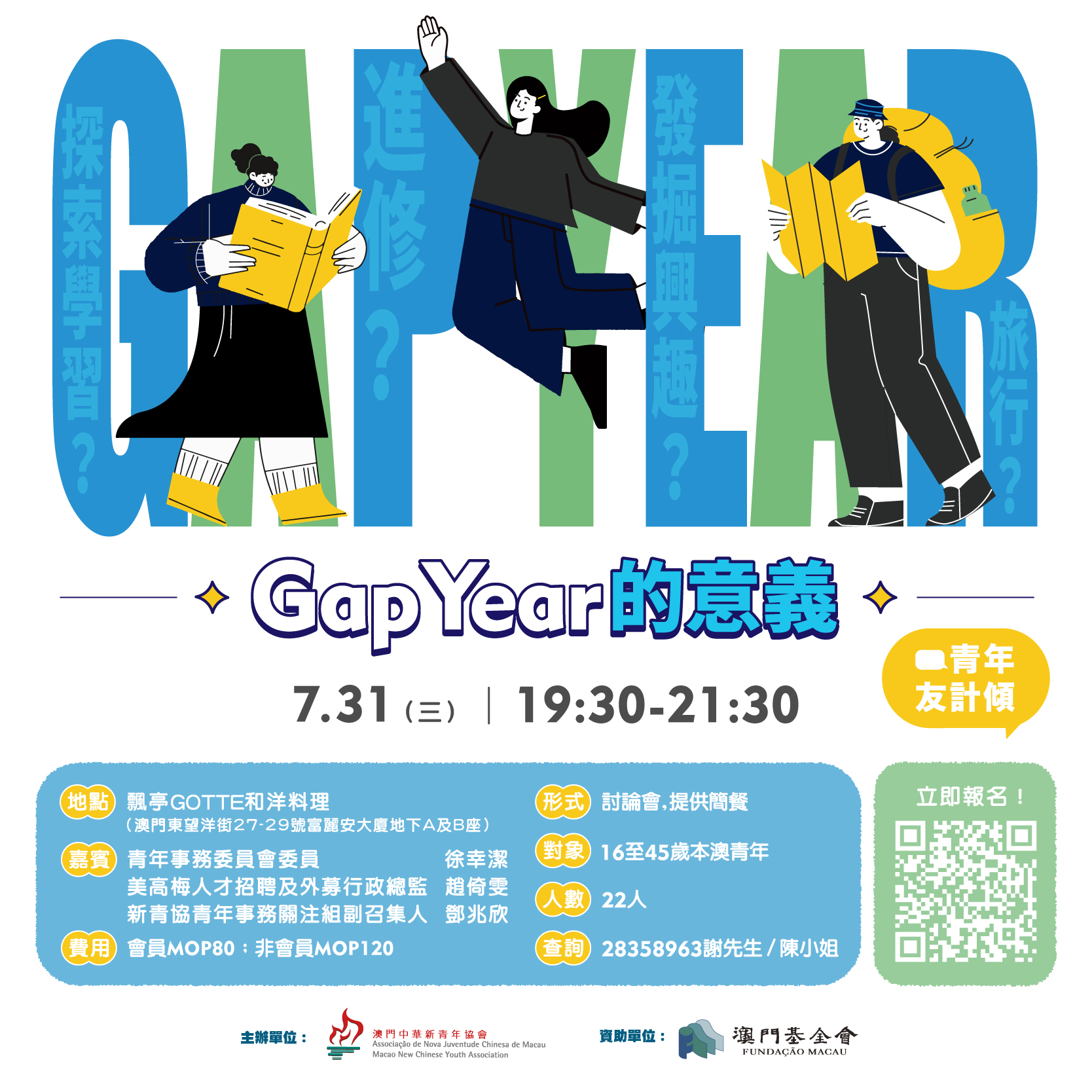 - Gap Year在歐美地區多指高中生或大學生選擇在學期間休學,前往他地感受不同文化及豐富閱歷,近年在國內的社交平台開始多見有關討論,依您觀察,澳門社會氛圍對於Gap Year的態度是怎樣?在澳門,Gap Year又多見什麼形式?