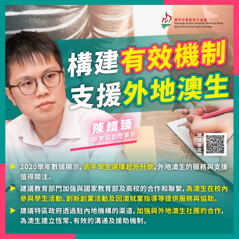 作為曾經外地澳生,陳皚臻表示,目前對外地澳生的服務支援,仍主要依靠學生自發組織的學生社團和民間社團提供,但在規模、資源上始終不足。他建議政府要建立恆常、有效的溝通和援助機制,通過特區政府駐內地機構的渠道,加強與外地澳生社團的合作,並為澳生所遇到的緊急狀況、醫療需求、心理輔導等方面提供及時的支援,為澳生在內地升學路上排除障礙。
