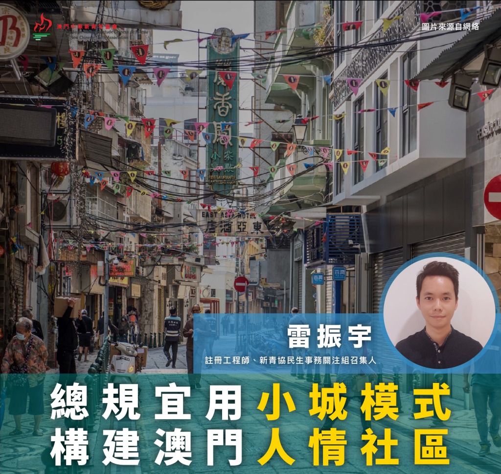 回顧澳門一直以混合功能發展為主,住宅、商廈及商舖夾雜其中的小城生活模式。社區中的街道和商舖除了通行和提供生活所需,亦是本地居民重要的社交場所,街道兩旁形形色色的商舖林立,這些由需求主導的商店,經過多年發展往往能提供最切合市民之所需,這並不是功能性配套可簡單取代。一代代的澳門居民習慣於這樣的社區環境中認識新朋友,與老街坊相遇,建立社區網絡。這種或者就是大家所講的澳門人情味亦不是通過現代都市模式能簡單複製。新城A區公屋群落成後,預料將有大量的澳門居民搬入,筆者建議分區沿用這種小城模式,建造迎合市民的生活社區。
