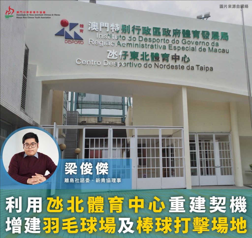 隨著氹仔北部有多個社區陸續啟用,以及根據《總規草案》,未來該區的閒置土地將被規劃為居住區,可預料氹仔北區的體育設施需求有增無減。政府當局應盡快開展前期意見收集和設計工作,爭取早日重建氹仔東北體育中心。