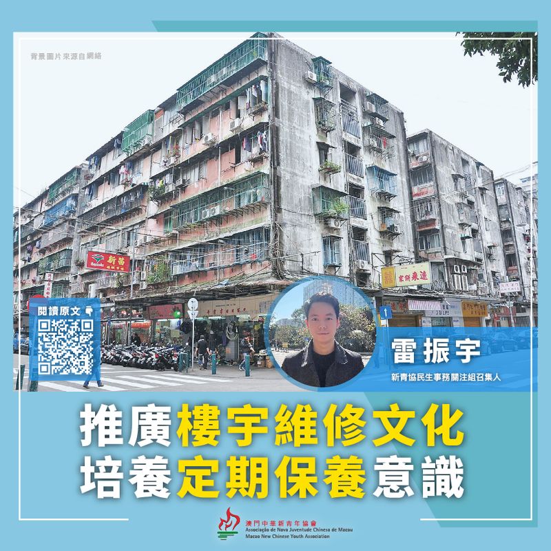 而外牆維修方面,可以借鑒香港市建局將試行的「小區規劃復修」模式,該計劃將向區內已經老化、有復修需要的樓宇業主提供財政資助和技術支援,除了協助進行樓宇復修外,還會研究協助業主為大廈外牆進行美化工程,鼓勵在進行大廈維修的同時,一併美化樓宇的外觀。澳門半島內不少老舊唐樓集中在旅遊區附近,這種模式除了可協助弱勢和積極性較低的業主修復樓宇殘破部分,延長建築物壽命,同時亦能美化市容及加強街道本土特色文化。