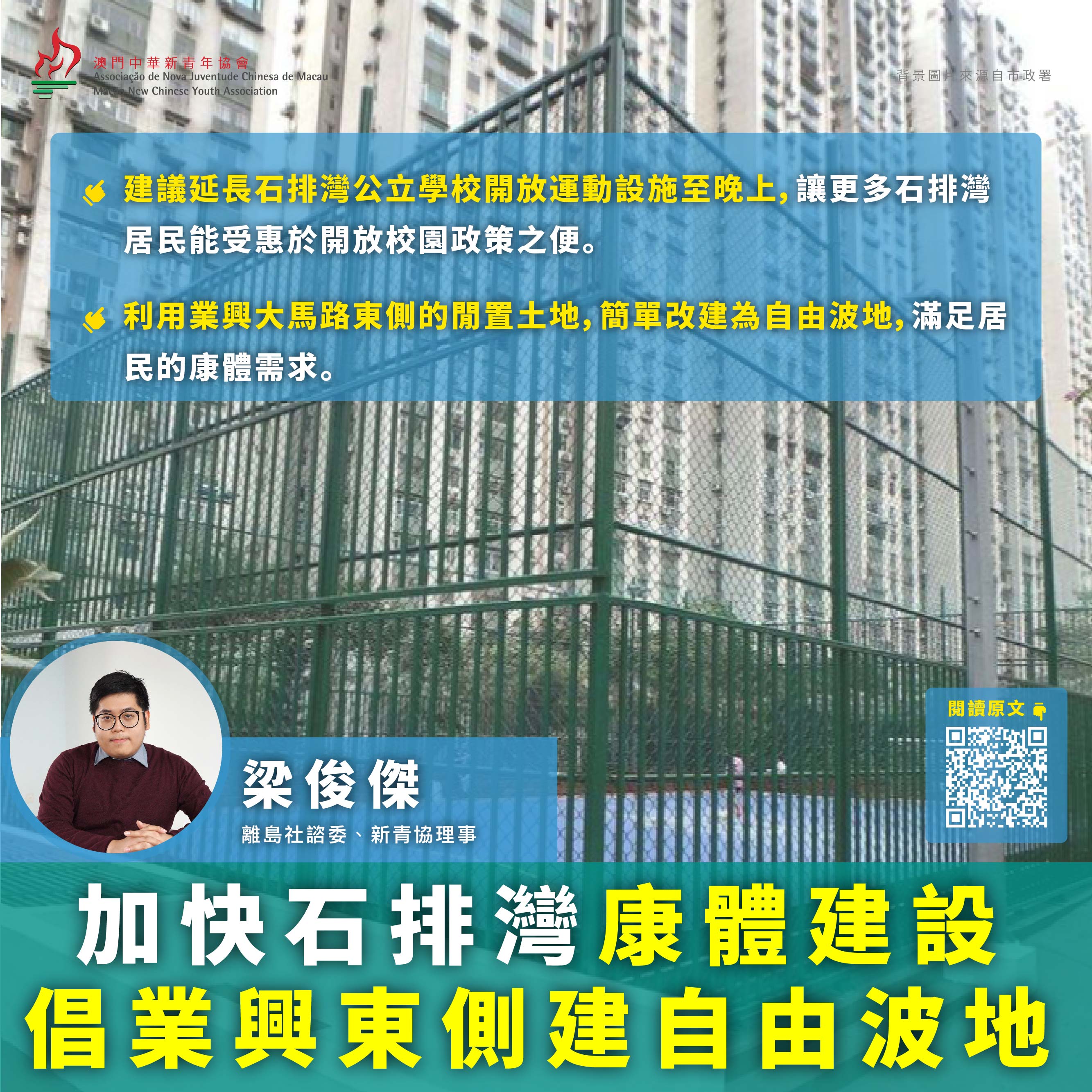 一,延長石排灣公立學校開放運動設施的時段。近期,石排灣公立學校開始面向市民開放室外籃球場、雨天操場和大型攀爬繩網設備。然而,開放時間主要集中在工作日的下午時段,以及周末的上、下午時段。建議石排灣公立學校可參照部分公立學校,適當延長開放時段至晚上,讓更多石排灣居民能受惠於開放校園政策之便。