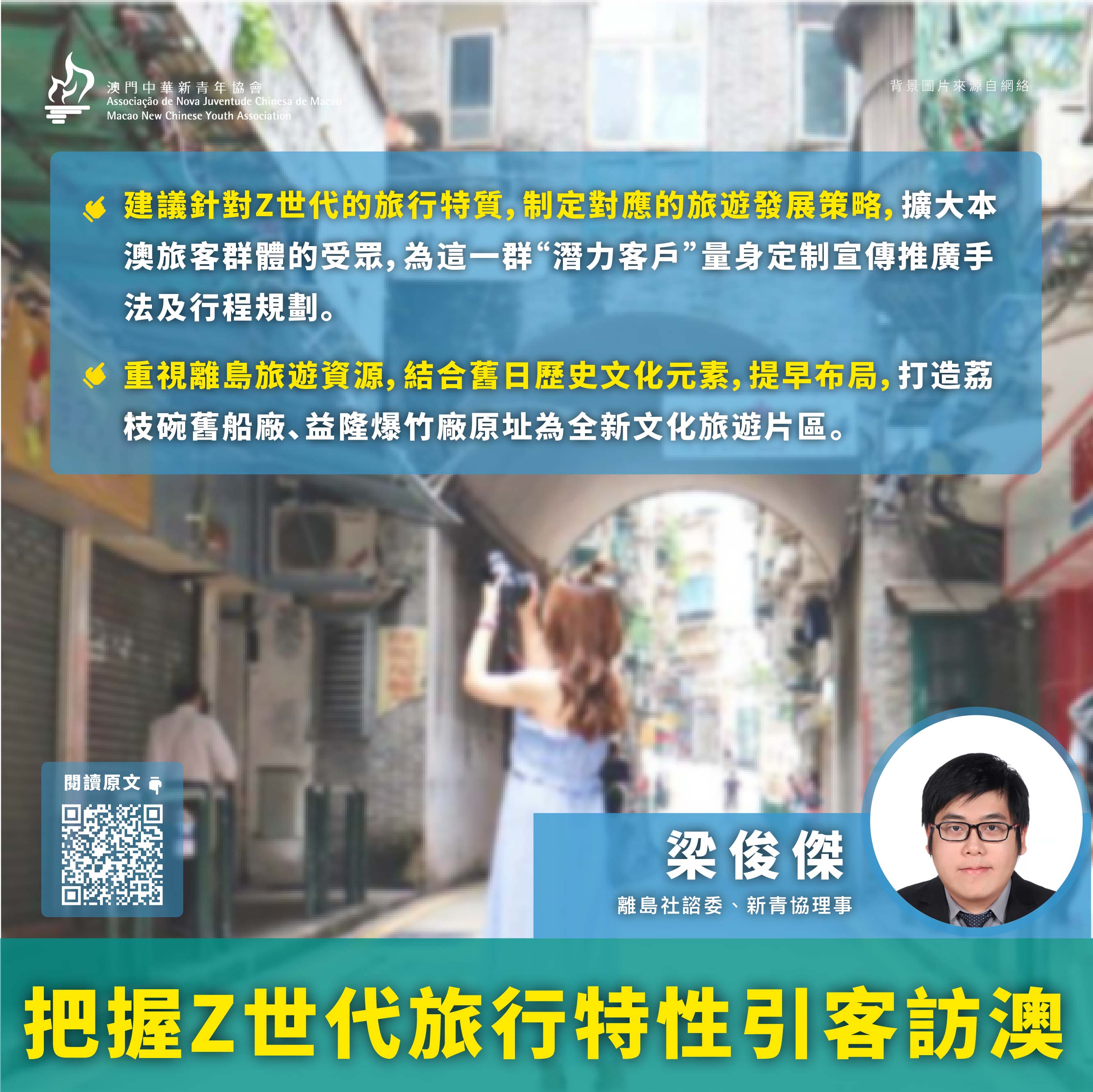 一,針對Z世代的旅行特質,制定對應的旅遊發展策略,擴大本澳旅客群體的受眾,為這一群“潛力客戶”量身定制宣傳推廣手法及行程規劃。例如政府可牽頭,聯同地區商會和民間組織籌辦更多以不同主題為名、含有更多體驗元素的精緻旅遊項目。同時,政府要活用內地青年人常用的社交平台,透過達人分享、景點懶人包等,讓他們能簡易、有效地獲取澳門的旅遊資訊。再進一步來說,當局更可透過大數據分析,分析在不同電商平台、搜尋器上本澳旅遊景點的搜尋數字和關鍵詞數據,把廣受歡迎的景點拍攝成獨立的推廣影片,上存至不同網上平台供潛在旅客參考,增加本澳旅遊競爭力。