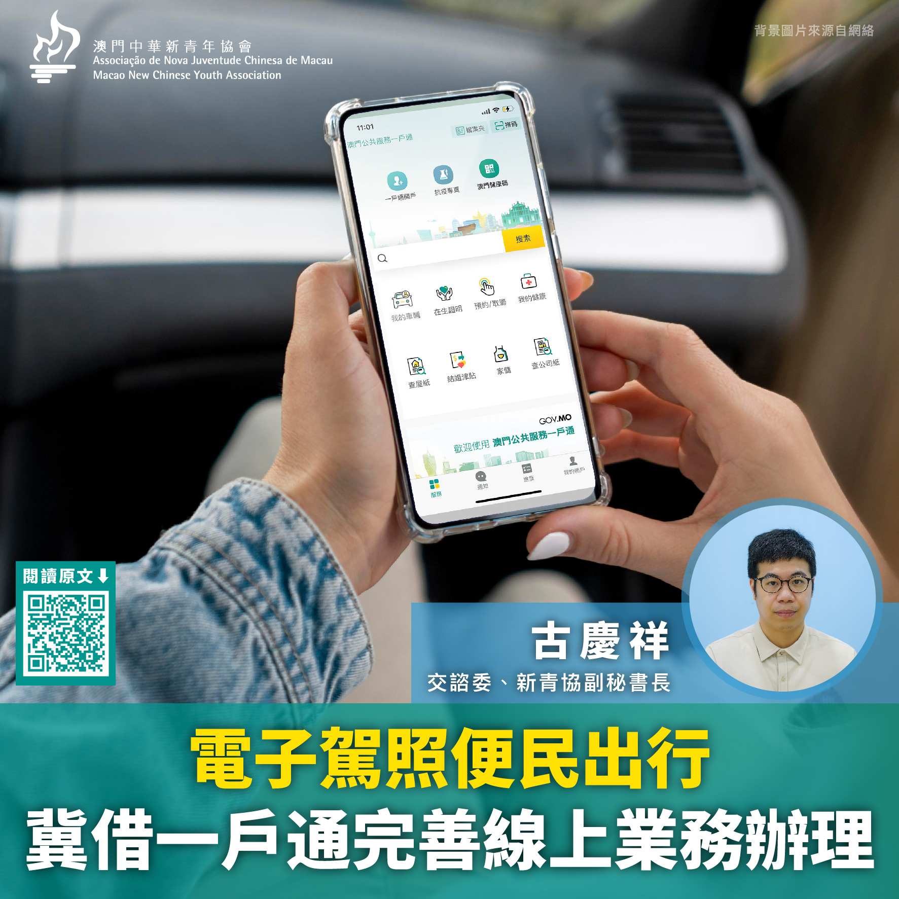 他續指,內地於去年十二月全面推行電子駕駛證,是公共部門深化“放管服”改革的一項重要舉措。根據資料顯示,內地的“電子駕駛證”具有統一性、即時性、安全性三個特點,並能動態顯示駕駛證狀態,方便駕駛者及執法者即時查詢、即時出示、即時核驗,確保駕照持有人駕照狀態無異常,值得澳門借鑑。古慶祥更建議,電子駕照未來要與現時一戶通內“我的車輛”功能高度結合,配合已推出的繳納行車稅及將會推出的繳納交通違例罰款等功能,實現駕駛者在APP內檢視駕駛狀態及處理繳費程序,減省行政程序。