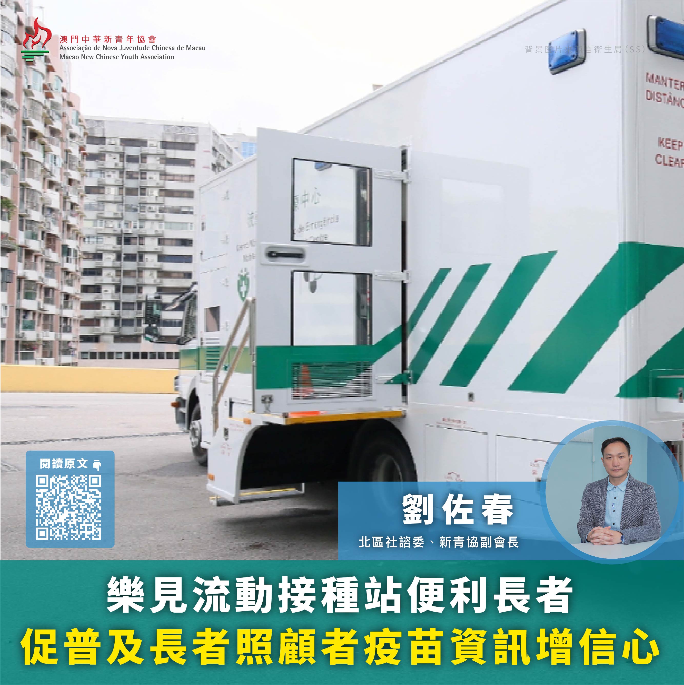 衛生局推出新冠疫苗流動接種站,在本澳適合停泊的居住社區或公園作定點停駐,便利長期臥床和行動不便人士接種疫苗。北區社諮委、新青協副會長劉佐春肯定局方主動解決長者接種困難的積極態度,協助長者建立對新冠病毒的防護力,建議局方同時對長者照顧者及社服團體推供資訊支援,使他們得以密切留意長者接種後的身體狀況,並提供及時支援服務。