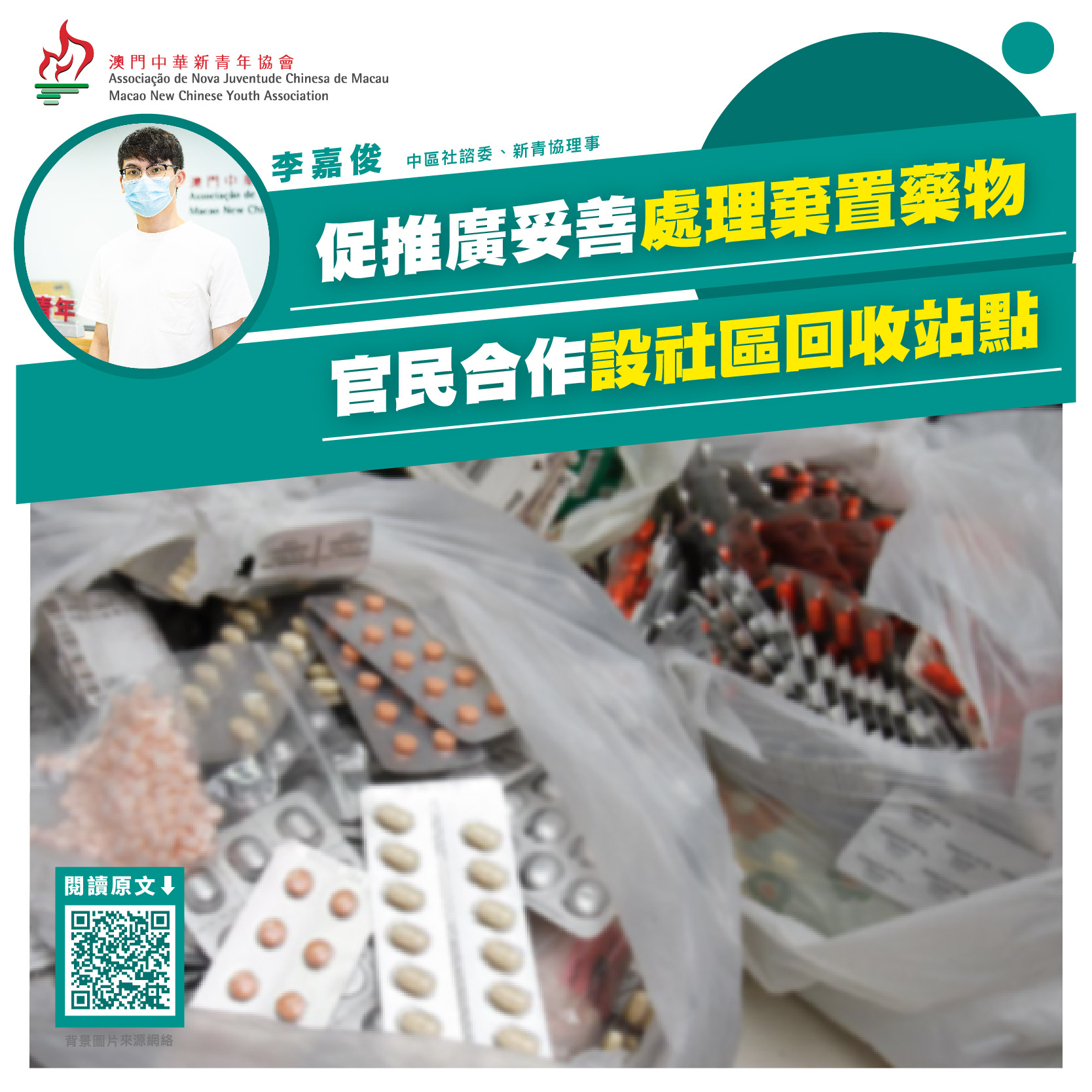 事實上,本澳早在2012年起於各區衛生中心、山頂醫院等設有藥物回收點,經統一收集後送往“澳門特殊和危險廢物處理站”銷毀,可惜普遍居民對有關措施了解不多,為進一步推廣相關資訊,提出以下建議: