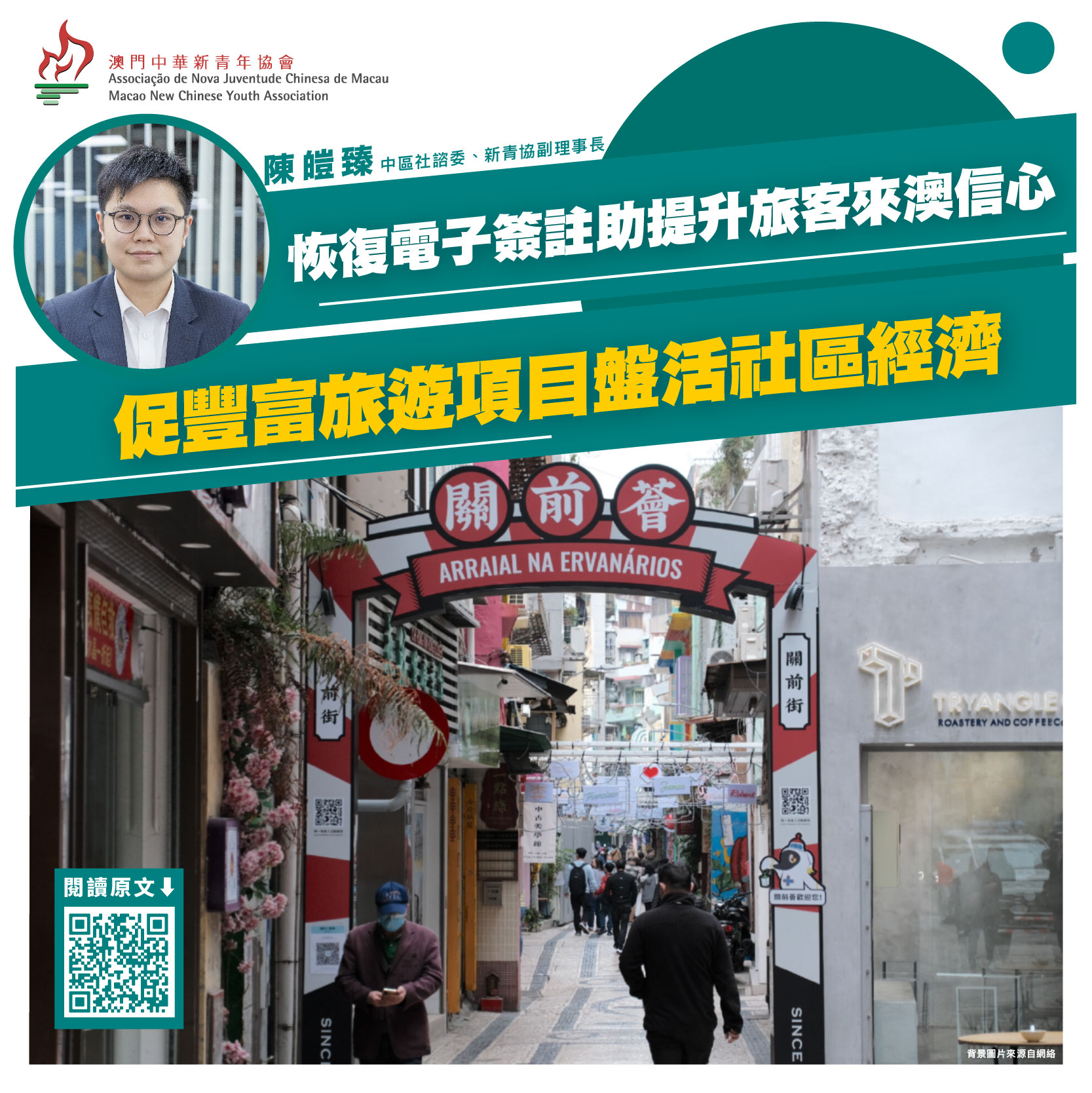 內地自本月1日起恢復赴澳電子簽註,中區社諮委、新青協副理事長陳皚臻認為,措施有助提升旅客來澳信心,期望政府把握中央一系列惠澳政策,豐富“旅遊+”跨界融合內涵,優化成效顯著的旅遊產品,從而吸引更多旅客到各特色社區,以助盤活經濟。