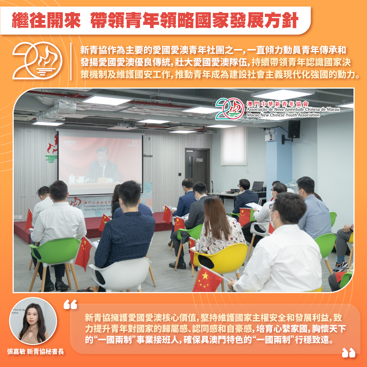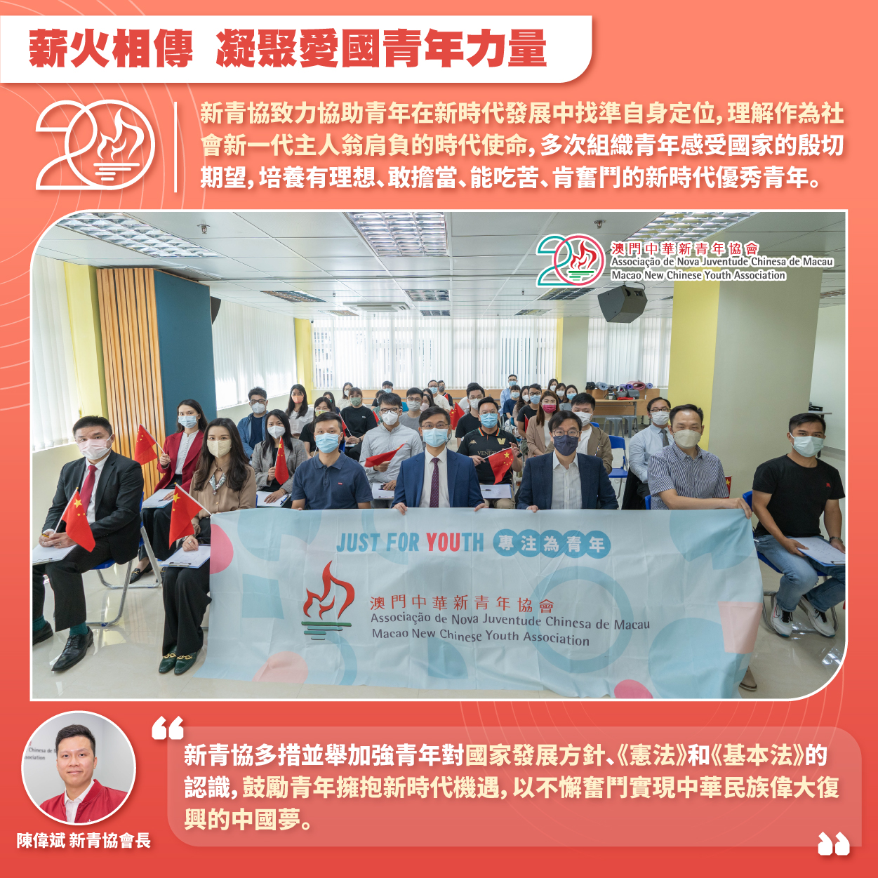 作為愛國愛澳的青年社團,新青協自成立起一直以團結廣大青年熱愛祖國、熱愛澳門、服務社會為宗旨,始終貫徹“專注為青年”的服務理念,切實做好青年工作,鼓勵澳門青年認識國家發展戰略,推動他們理解肩負的時代責任,成為有德有才的“一國兩制”事業接班人,推動“一國兩制”事業行穩致遠。