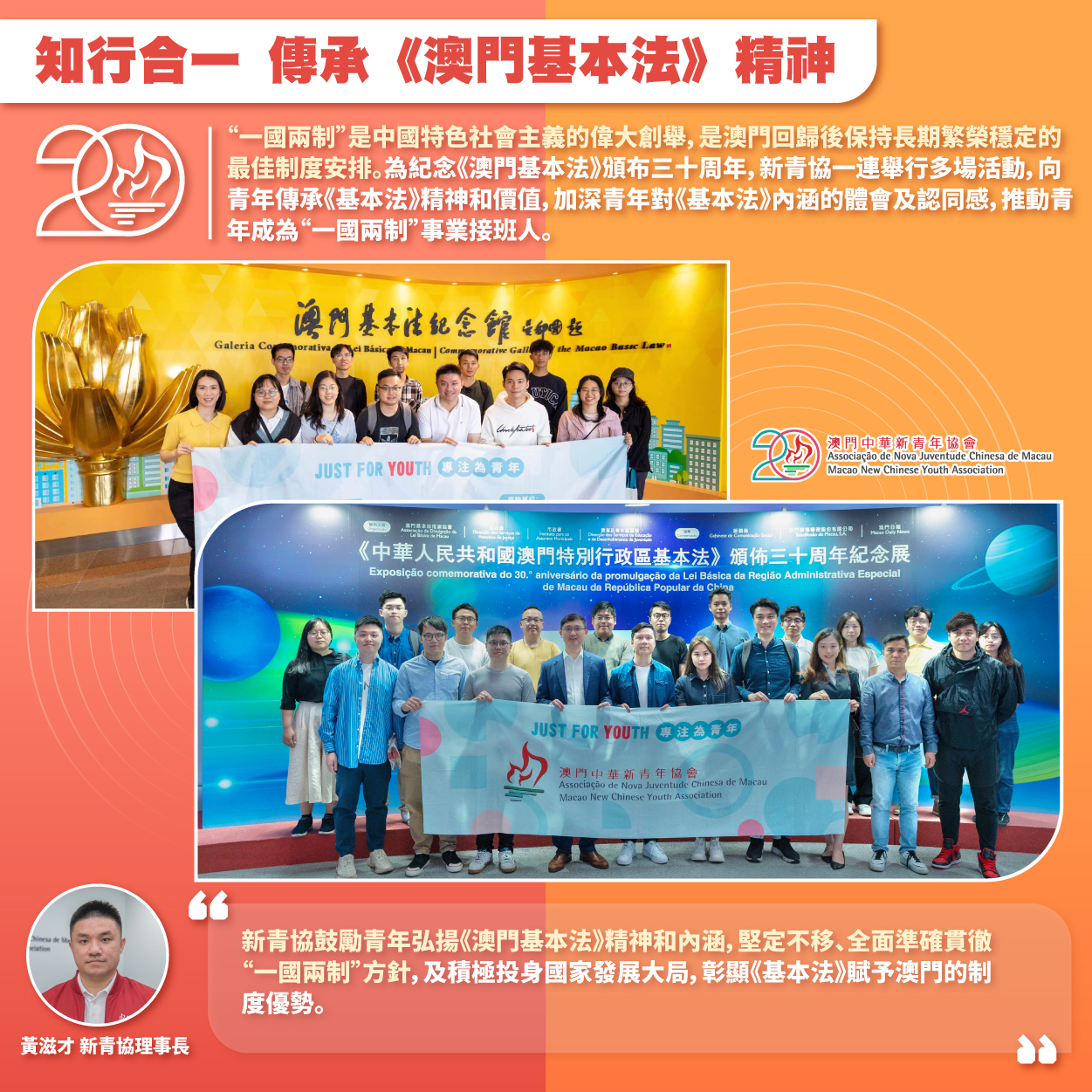 理事長黃滋才指出,新青協通過多元豐富的系列活動,鼓勵青年主動學習和弘揚《澳門基本法》精神和內涵,堅定不移、全面準確貫徹“一國兩制”方針,用好國家惠澳政策,積極投身粵港澳大灣區和橫琴粵澳深度合作區的建設,彰顯《基本法》賦予澳門的制度優勢,保障澳門的長治久安。