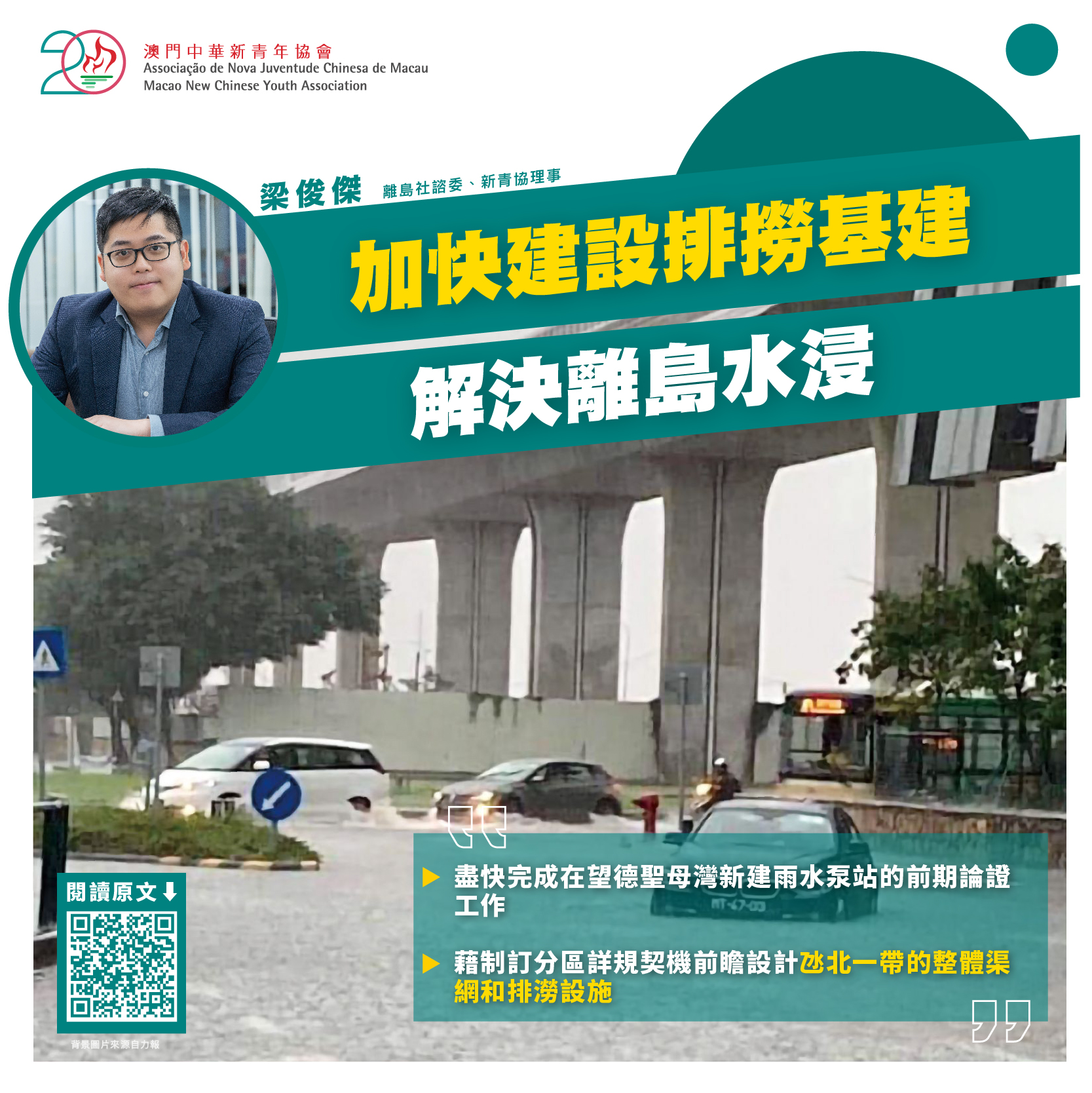 事實上,前土地工務運輸局2016年完成了“改善氹仔雨水排水系統”的研究,指出排角泵房排水能力比氹仔現況所需的設計流量不足,同時進入氹仔南部涵箱的集水面積過大,在潮汐升高時雨水易從涵箱倒灌至低漥地區。前工務局雖然已在2017年完成建造氹仔大潭山雨水截流工程,紓緩氹仔地堡街排水系統的負荷,但從近年氹仔舊城區“逢大雨必浸”的水浸情況來看,治水問題仍然是任重道遠。