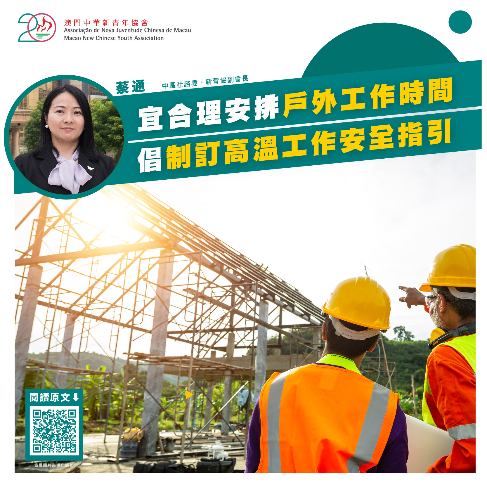 - 政府應制定專門的高溫工作安全指引,更好保障勞動權益。本澳現行的颱風、暴雨及特殊天氣情況下所採取措施,只針對最高氣溫達攝氏四十度或以上才實行,建議參考鄰近地區做法,針對酷熱天氣下或高溫環境中工作制定指引,提醒僱主及僱員採取適當措施,預防因高溫工作而出現不適情況。