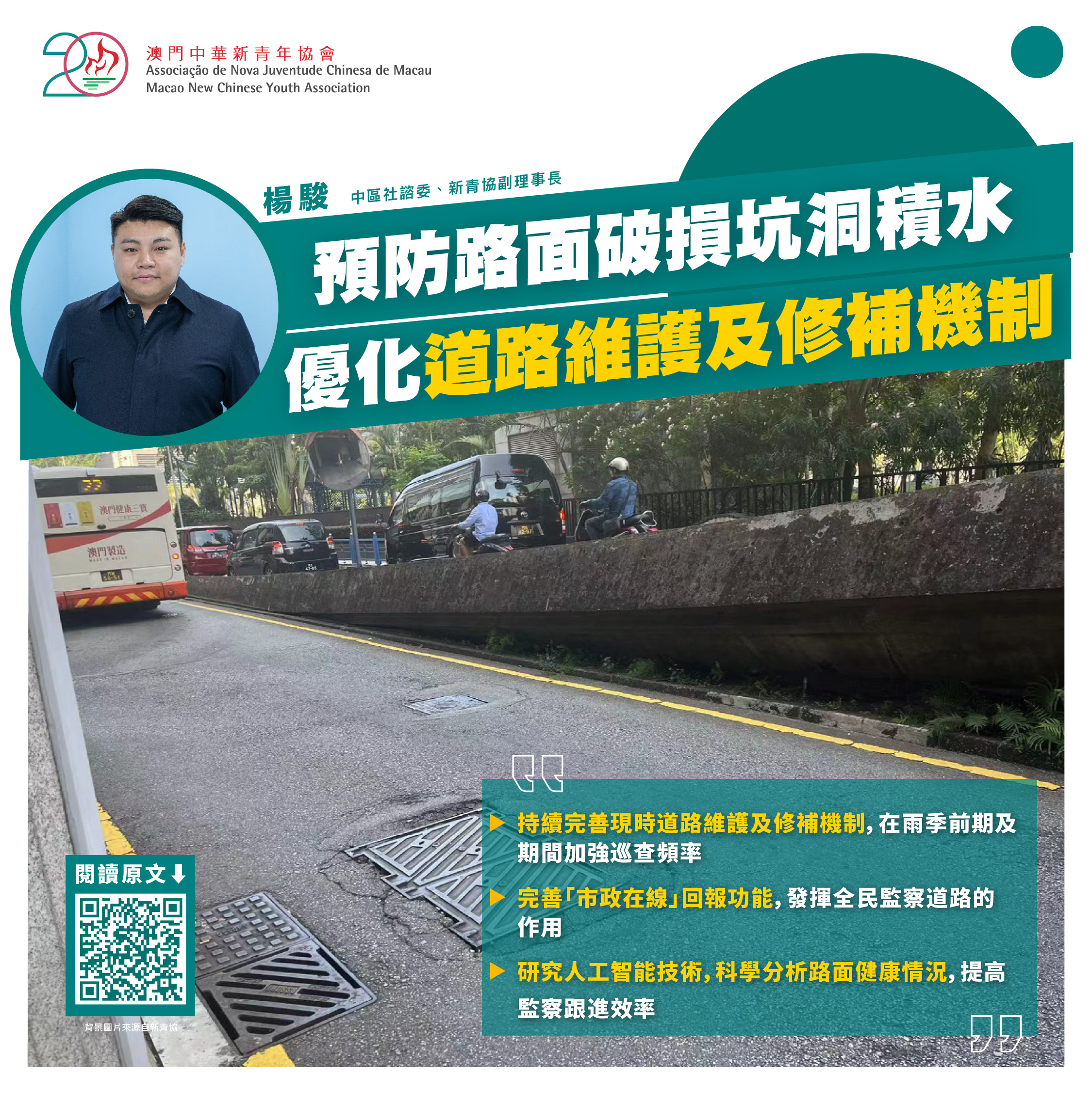 為改善上述問題,市政署早前已引進內地學術機構的新型瀝青材料及技術,相較於舊式瀝青提升了整體行車安全性及路面耐用性。目前正分階段動工的友誼橋大馬路及周邊道路重鋪工程則為使用新型瀝青鋪整,期望有關部門完工後能夠持續監察使用情況,並適時推及至本澳不同路段。