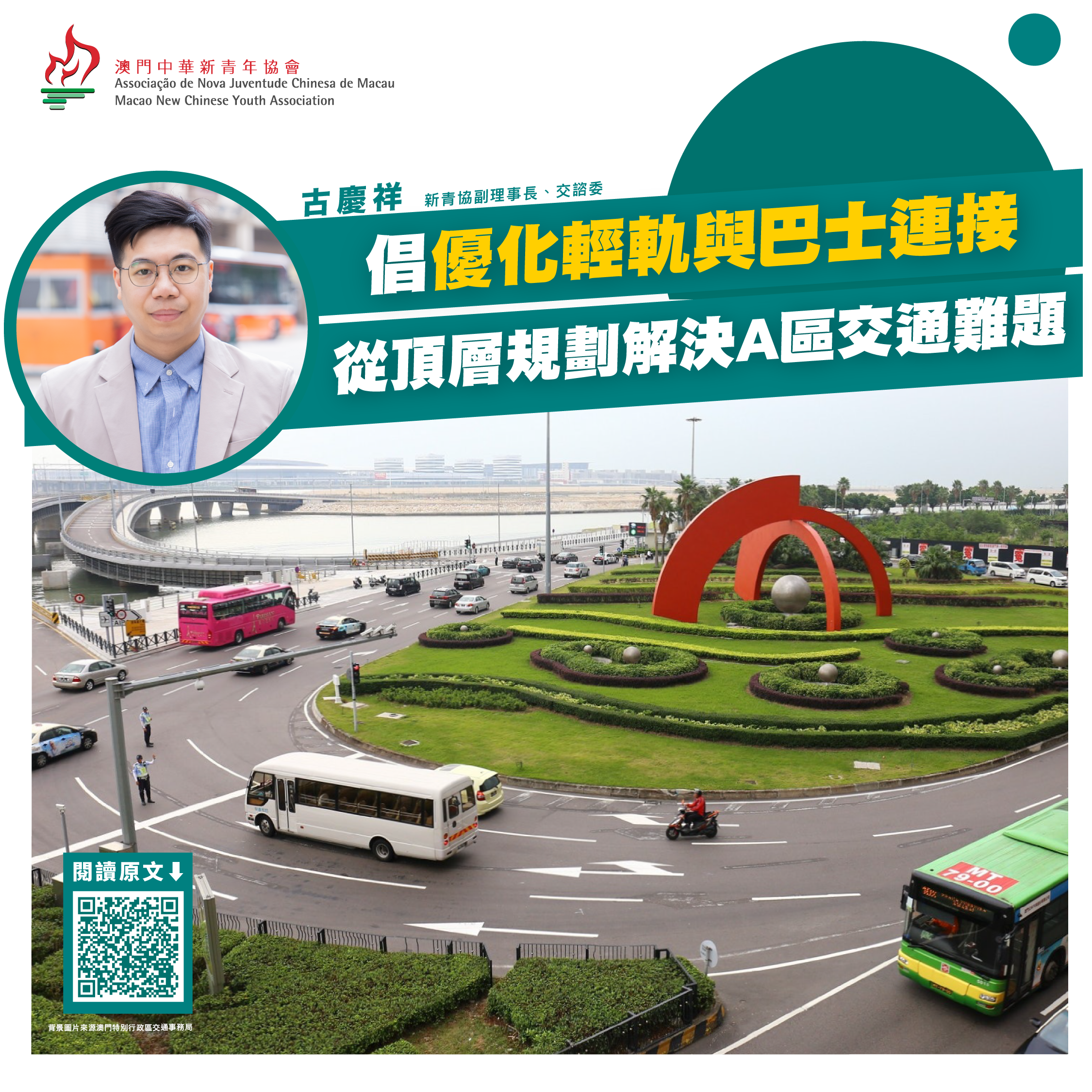 新城A區交通問題長期受社會關注,前運輸工務司司長羅立文早前在立法會回應相關提問時表示「A區一定會出問題,塞車問題無法解決,只能優化,交通肯定不會暢順,相信神仙先搞得掂啲交通」。交通諮詢委員會委員古慶祥認為,新城A區的交通痼疾源於基建之間未能互相配合,建議政府從頂層角度進行交通規劃,抓緊建設澳門半島與新城A區間的連接道路建設;並以輕軌優先、綠色出行為導向,優化輕軌站與其他交通工具的連接,及利用好立體交通思維,推動步行系統的不斷完善。