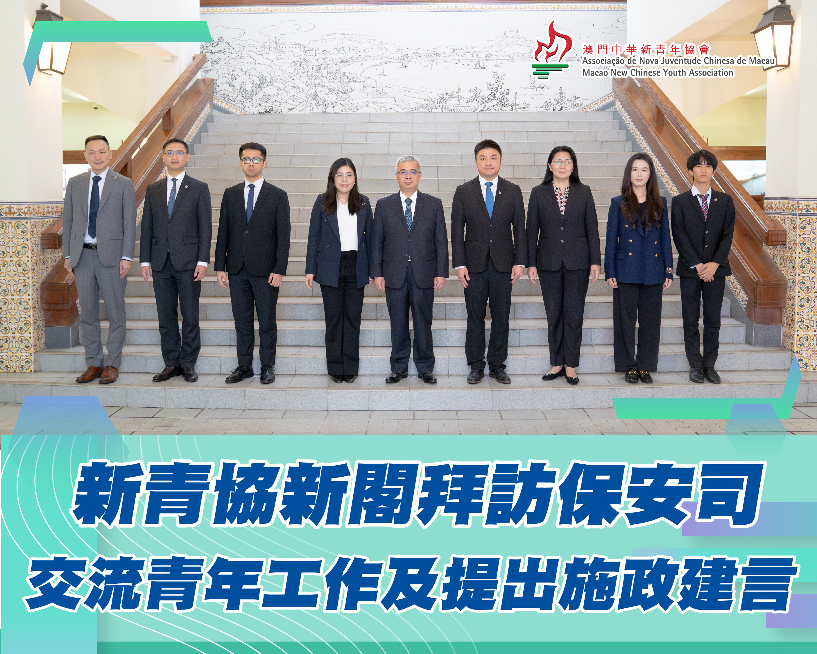 澳門中華新青年協會會長梁倩文帶領新屆架構成員拜訪保安司,獲黃少澤司長接見。會上,新青協匯報會務發展及未來工作。雙方亦就國家安全、打擊詐騙、防毒禁毒、社區警務、口岸通關等工作深入交流。會後,梁倩文代表協會向司長遞交青年施政建言書,搭建青年與保安範疇的溝通橋樑。