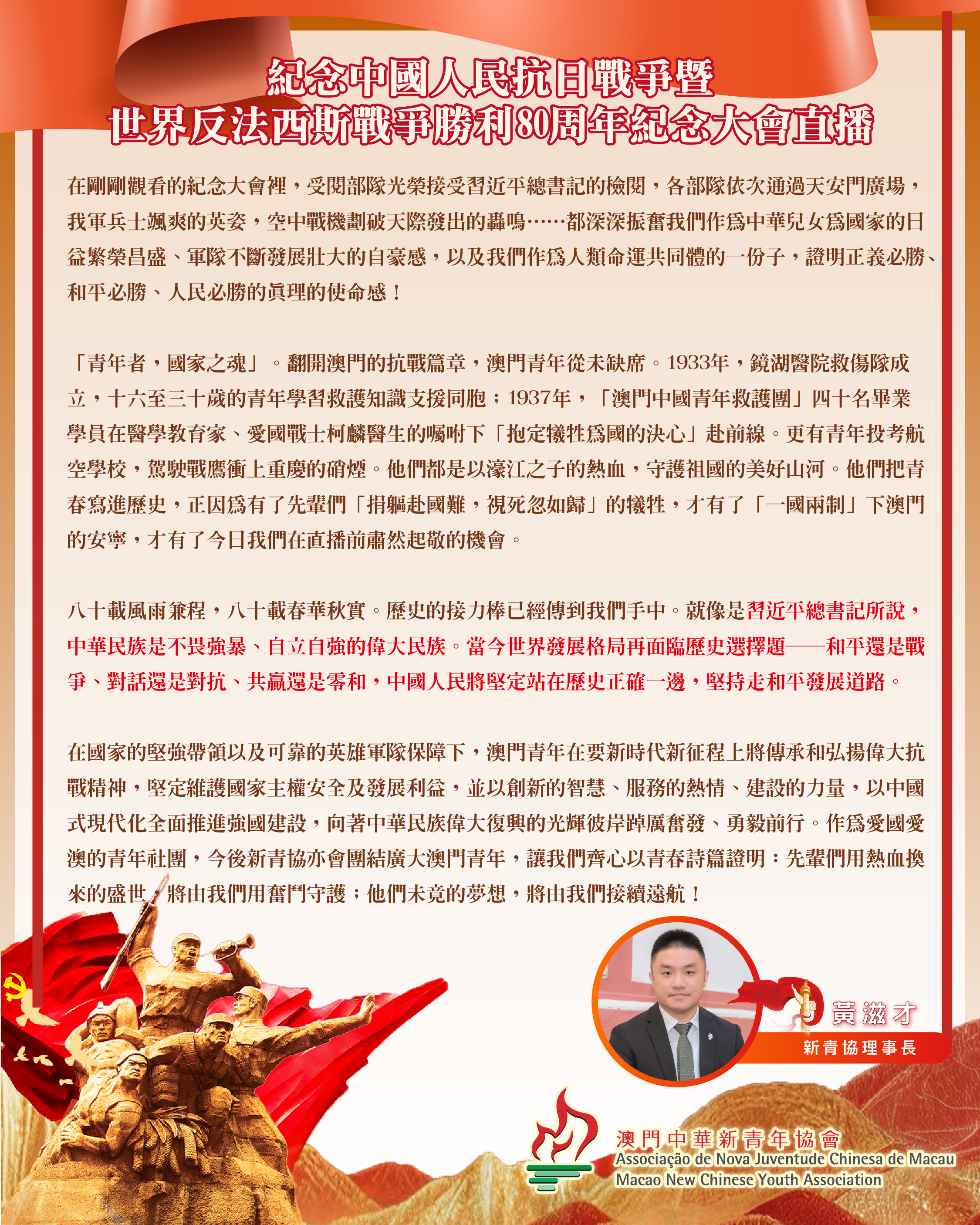 新青協理事長黃滋才於直播現場接受媒體訪問,他表示紀念大會上的閱兵場面震撼,所展現的國家發展讓中華兒女自豪,青年必須緬懷先烈和傳承抗戰精神,並要體現在日常生活中,為國家發展及澳門繁榮穩定貢獻青年力量。