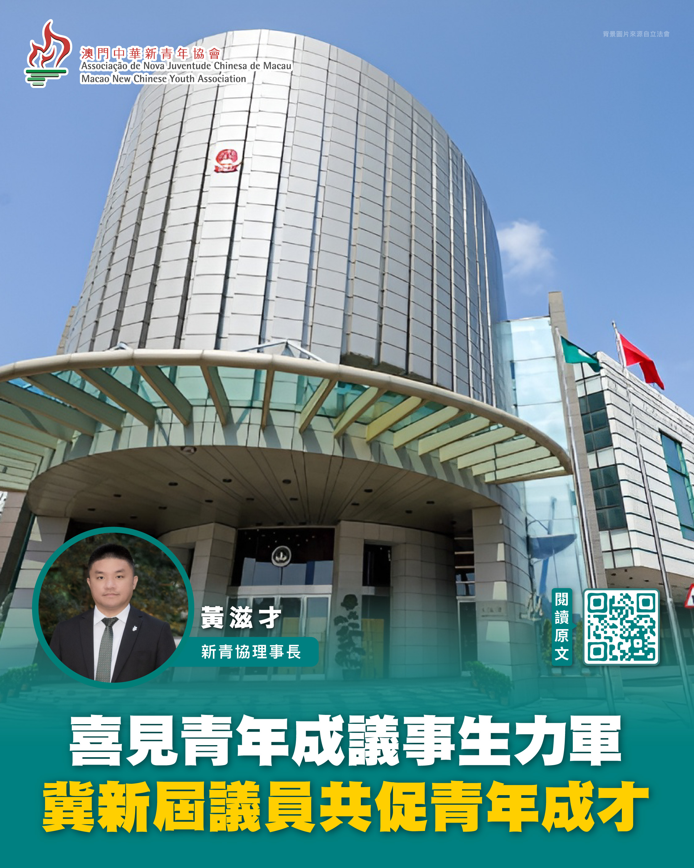 第八屆立法會選舉日前順利完結,選出新任的14名直選議員及12位名間選議員。新青協理事長黃滋才向當選的議員致以熱烈祝賀。他認為,是次選舉作為修訂《立法會選舉法》後的首次實踐,全面落實「愛國者治澳」原則,充份彰顯「一國兩制」行穩致遠的制度優勢。