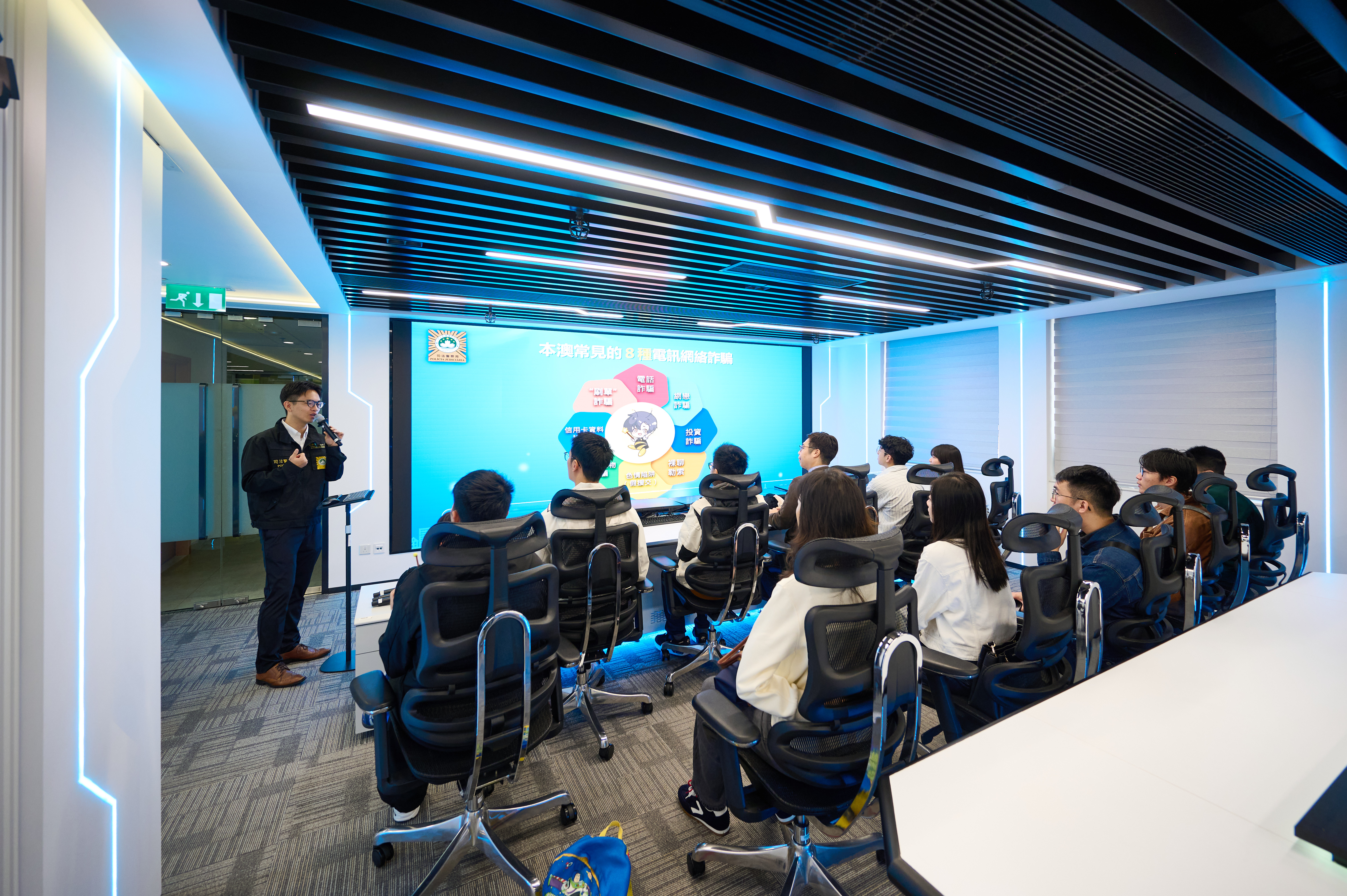 青年隨後分別參觀了中心的戰情指揮區、宣傳教育展示專區、獨立熱線支援辦公室及多媒體工作室,了解中心的日常運作與職能。司警局亦特別提醒須警惕新型AI換臉換聲詐騙技術,呼籲社會大眾保持防騙警覺,落實「一人醒目,全家精明」,透過警民協作實現全民反詐。