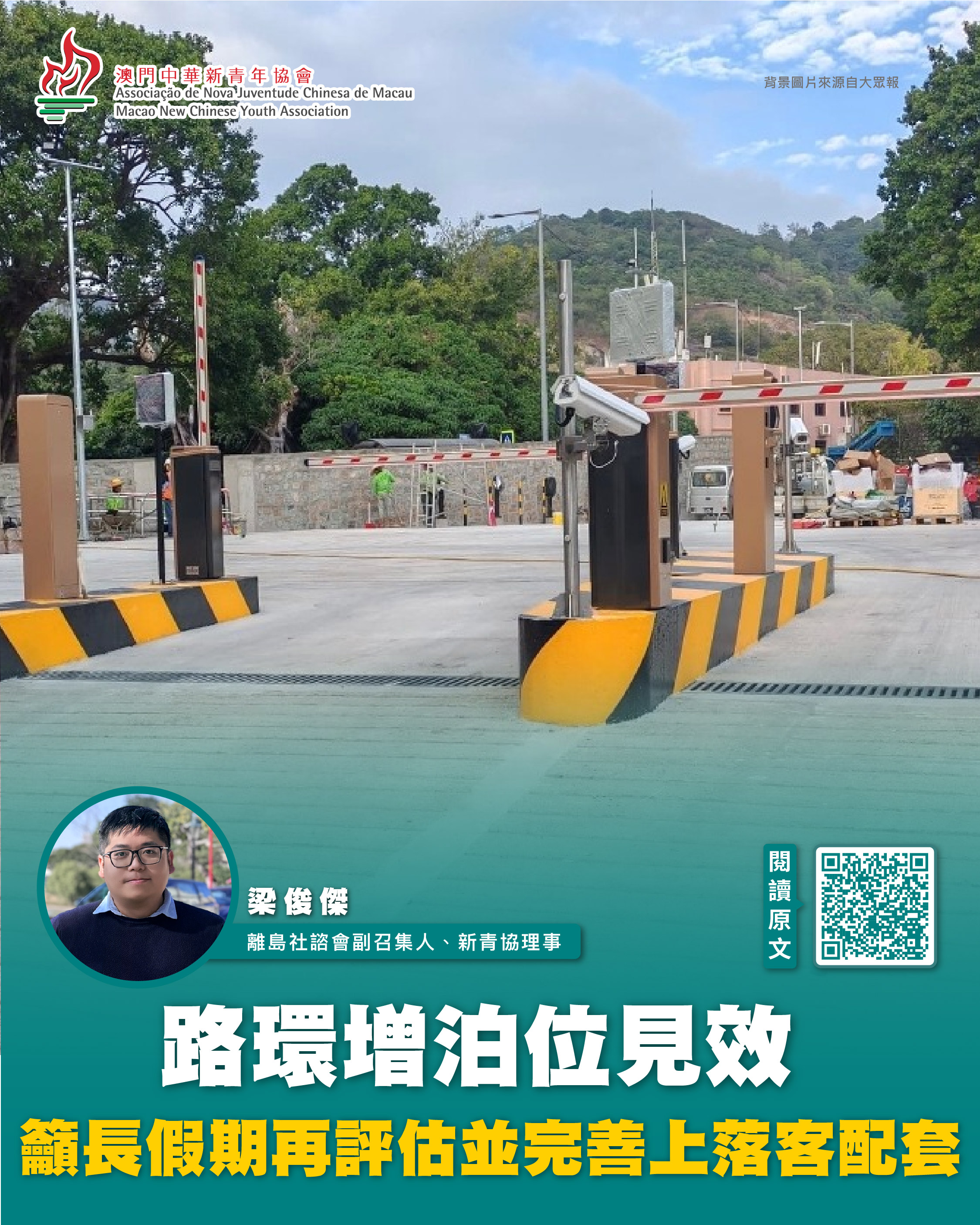 他指出,新開放的打纜街停車場增加泊位供應,單以輕型客車計已新增約70個車位,較以往路環市區約一百多個合法車位明顯提升,有助紓緩假日車位緊張情況;惟整體承載力仍需待春節、復活節等長假期再作客觀評估。此外,15分鐘免費措施有助促進車位流轉,便利居民及旅客短停購物(如購買葡撻),減少店外上落客帶來的路面擠塞。