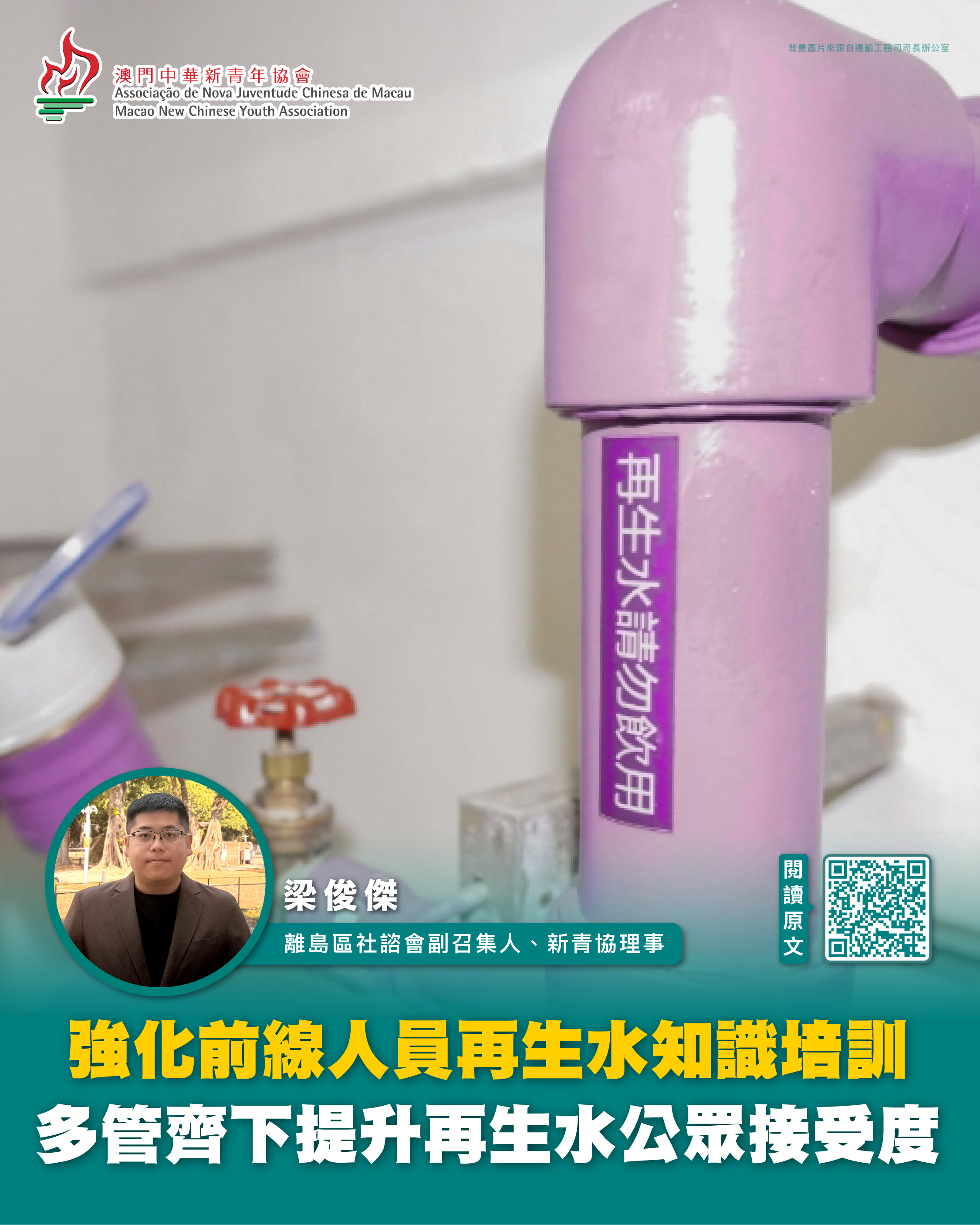 昨(19)日行政長官批示正式劃定再生水公共配水服務範圍,核准由澳門自來水公司收取的供水收費。離島社諮會副召集人、新青協理事梁俊傑認為,再生水對澳門居民仍屬新事物,建議政府從宣傳教育、水質監控、價格優勢及系統可靠性等多方面著手,以提升公眾接受度,助力再生水於未來擴展至更多社區。